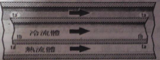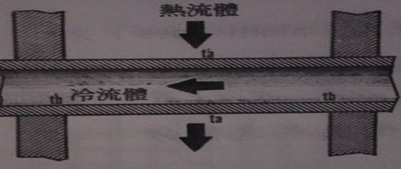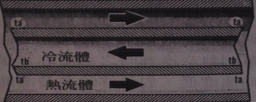 (2)對流式:冷熱兩種流體一相反方向流動者。此熱交換器適用於一流體要得高溫或低溫。(如下圖)